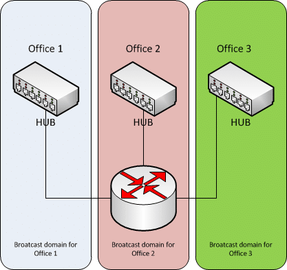 The communication on the internetwork is possible only if the node connected to a specific physical network matches the network number. Here you can notice that each and every department had a separate LAN of its own, in order to include a new user to Office 1, by plugging them into the Office 1 LAN and in this way they will automatically become a part of the broadcast domain as well as Office 1 collision domain. This old system and design worked well for several years. There was a big defect in it: when the hub for Office 1 is fully occupied and you want to include another user to the Office 1 LAN then what will happen? In other words, what will happen if there’s no space available for the new user or employee? In case, if there is enough space in the Office 2 department of the building then the new employee have to adjust with the Office 2 people, which means that the poor employee will be accomodated/ plugged into the Office 2 hub. As a result the new user will become a part of the Office 2 LAN, which is not good for several reasons. The first reason is the security problem, as the new employee now is part of the Office 2 broadcast domain and so all the same servers and network services will be visible to this new user like it is visible to other users of Office 2.