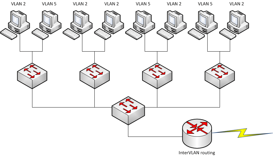 In this figure you can figure out the use of two VLANs (these are 2 and 5) to establish a broadcast domain for each segment/department.