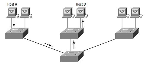 The routers permit the broadcasting within the originating network only but it does switch forward the broadcasts in each and every compartment or segment. It is called flat network not because of its flat design but due to the reason that it has a single broadcast domain. As shown in the figure the broadcasting by Host A is forwarded to all the ports on all switches leaving the port that received it in the beginning.