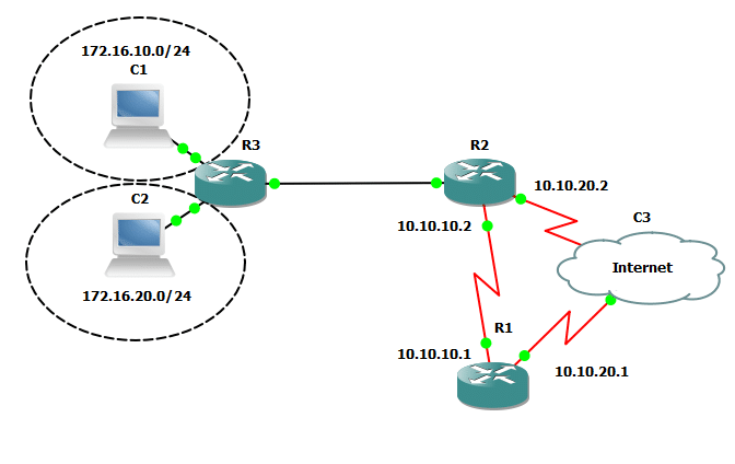 I made a simple example to show how this works. Let’s say that R1 is a branch router that will use a floating static route to send Enterprise traffic across the Internet but only if the leased line is broken or when the IGP-learned path across the private link fails. This is a normal situation where some branch office is connected to the company infrastructure with a private link and uses Internet connection for the backup.