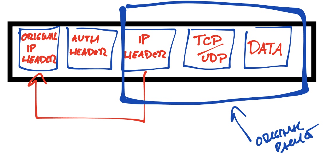 Transport mode only protects the payload no headers involved in encrypting and concealing of bits. Data is encrypted, authenticated, and all the that together but header remains exactly as it was. The payload will in that way be hidden by the IPSec headers and trailers. Same old ESP header and trailer, an AH header, or both. Do not confuse yourself when looking those images down there, the header remains the same but it’s still duplicated and prepended to original payload that was protected by encryption and stuff. In that way it can be used to get the packet routed from sending towards receiving peers (you need some kind of header for router to decide where to send the packet next, right?).